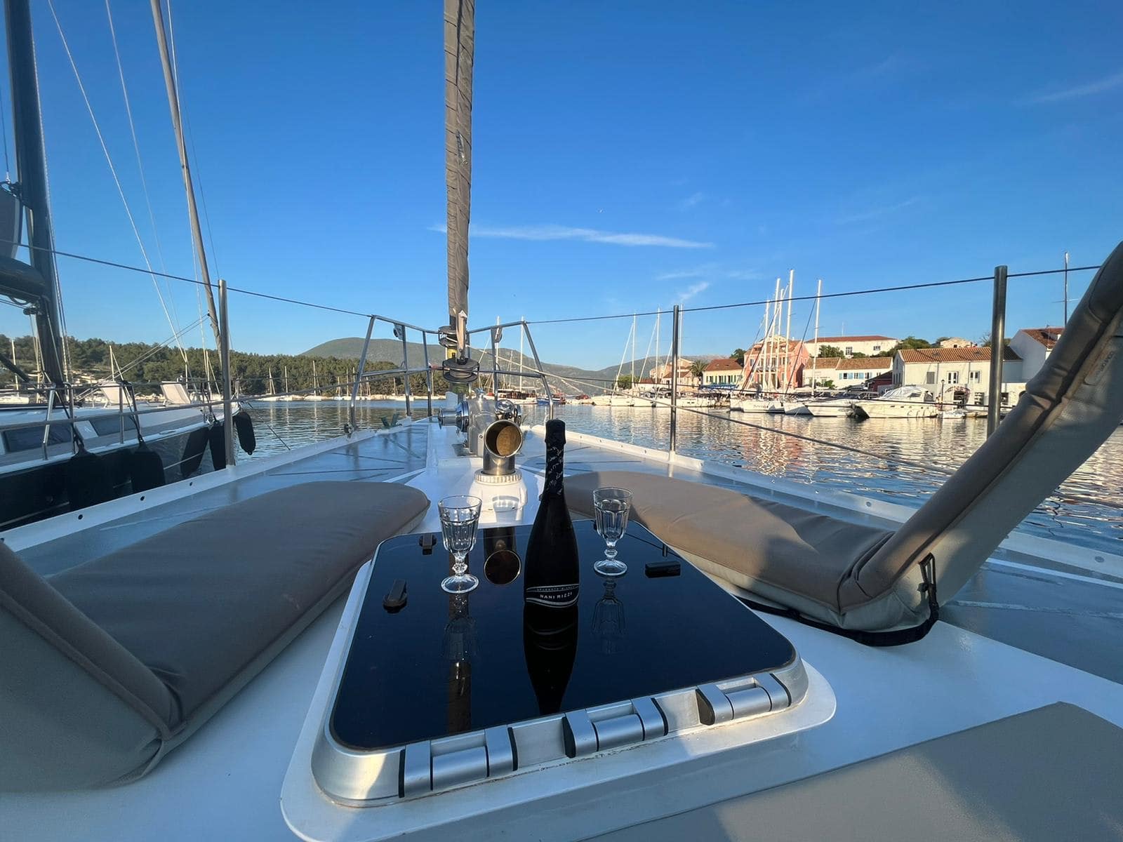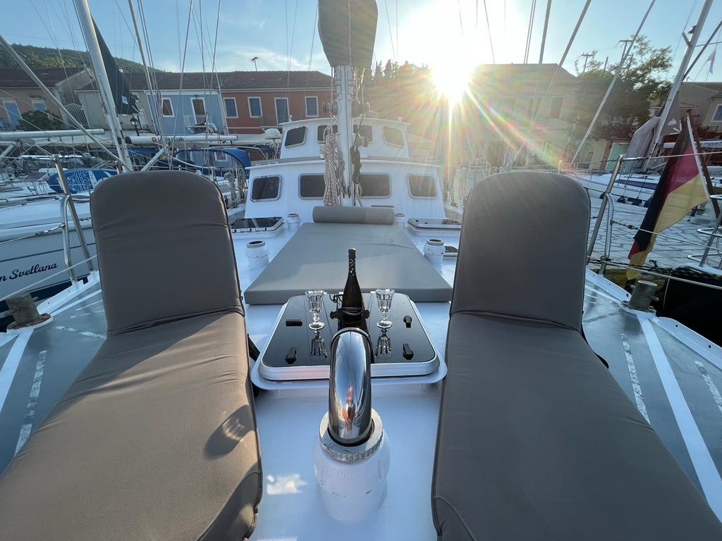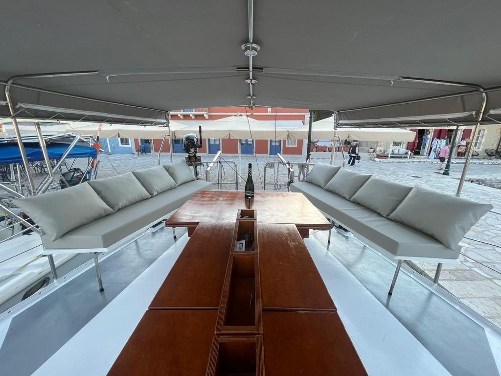 A bordo, troverai una perfetta armonia tra zone soleggiate e ombreggiate: goditi il calore del sole nel nostro vasto solarium a prua, dotato sia di morbidi cuscini che di eleganti lettini, oppure rifugiati nell’ampia area ombreggiata a poppa, dove un tavolo da pranzo all’aperto ti invita a godere di pasti al fresco accanto alla nostra area BBQ, perfetta per serate sotto le stelle.