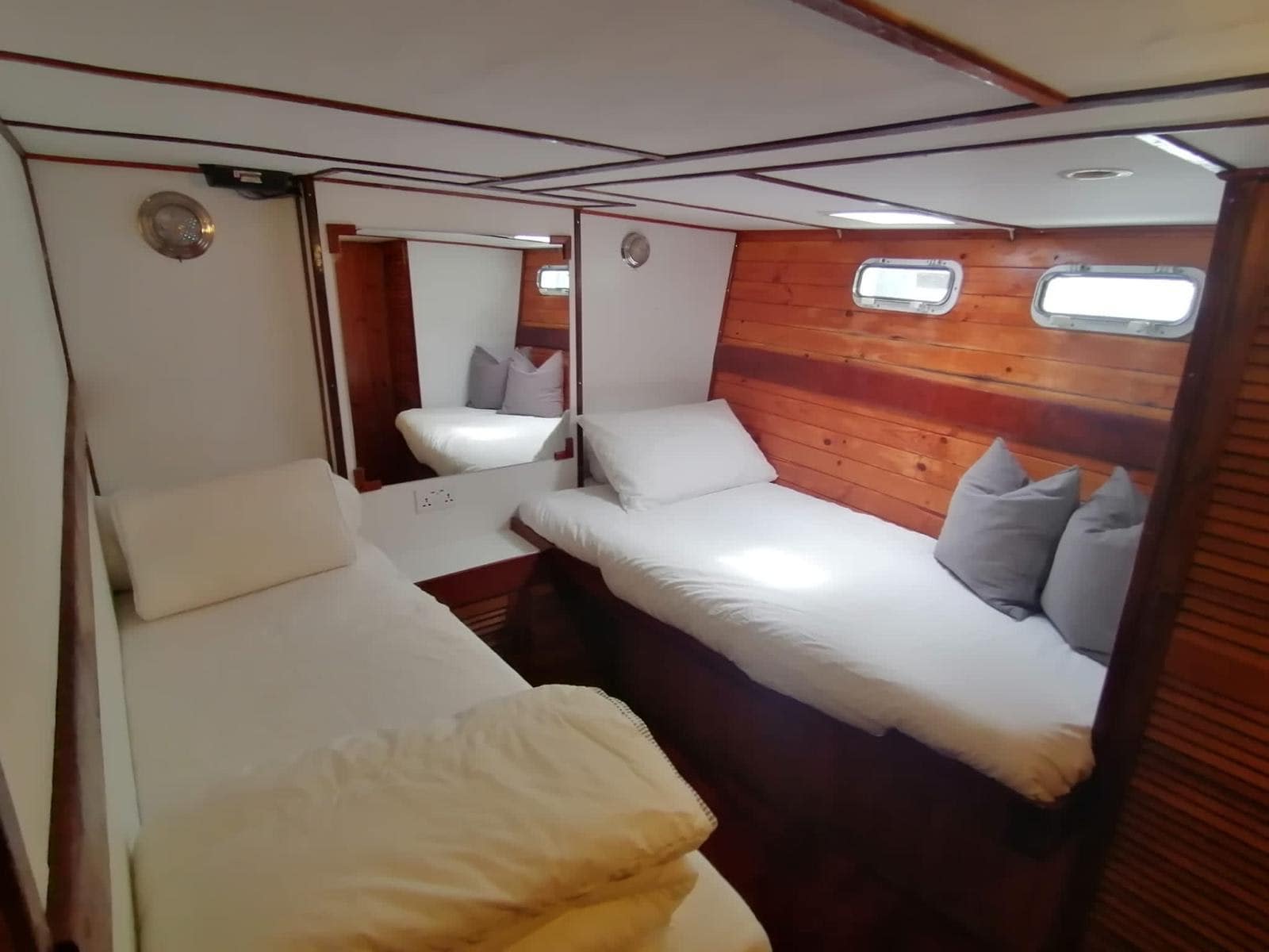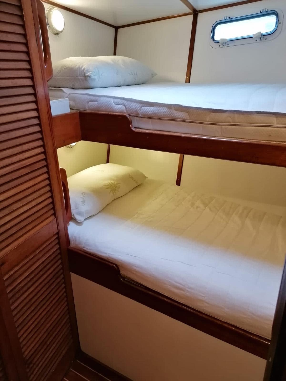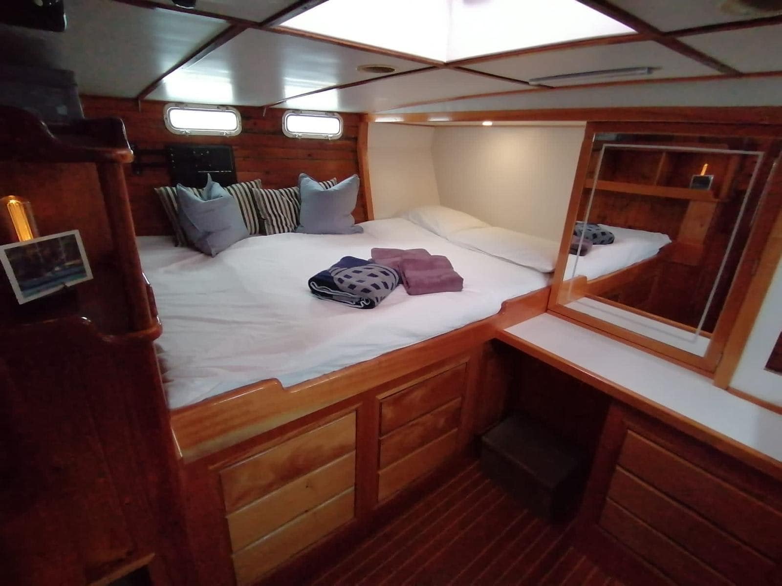La cabina armatoriale, situata a poppa, è un vero e proprio capolavoro di eleganza e spaziosità, promettendo notti di riposo indimenticabili sotto il manto stellato.