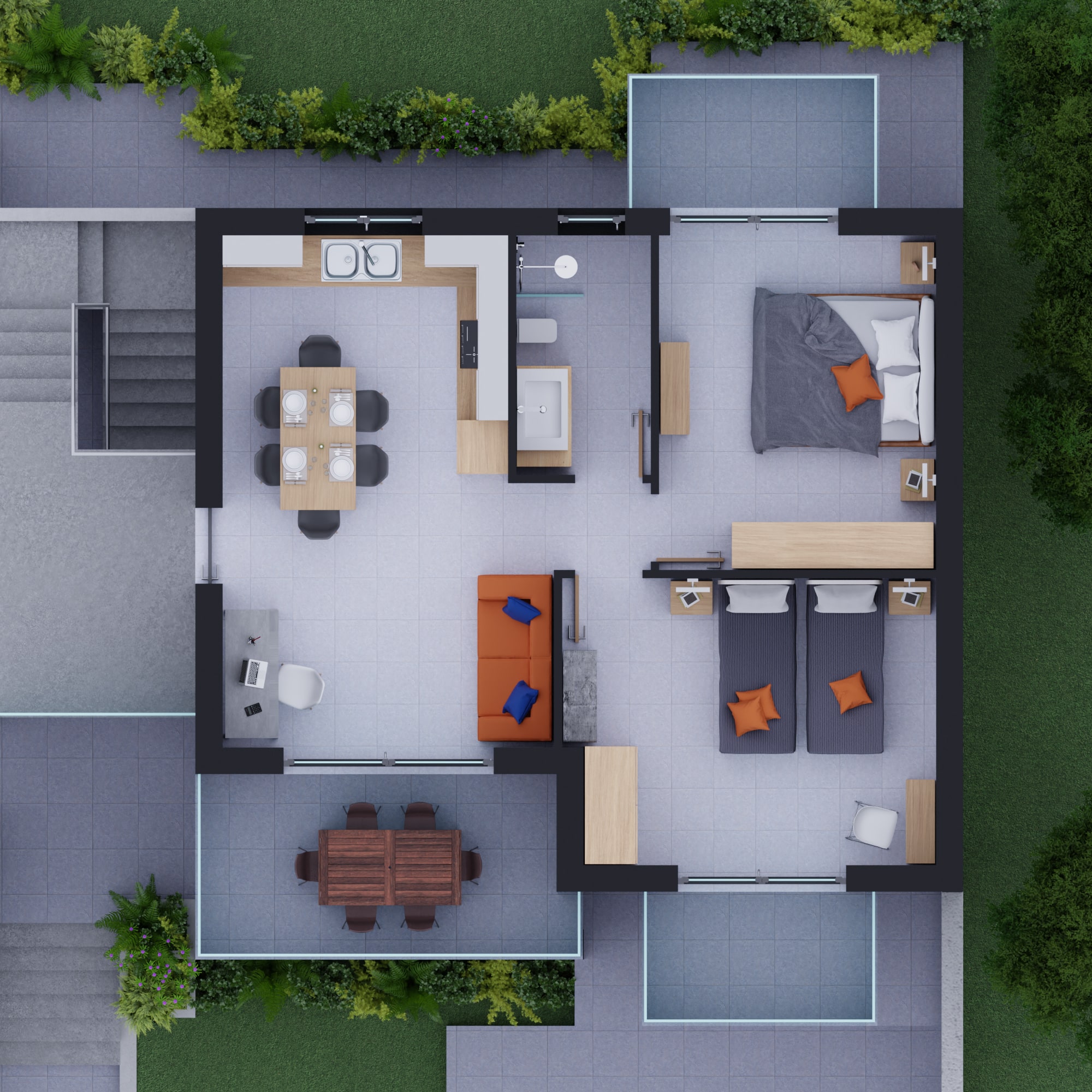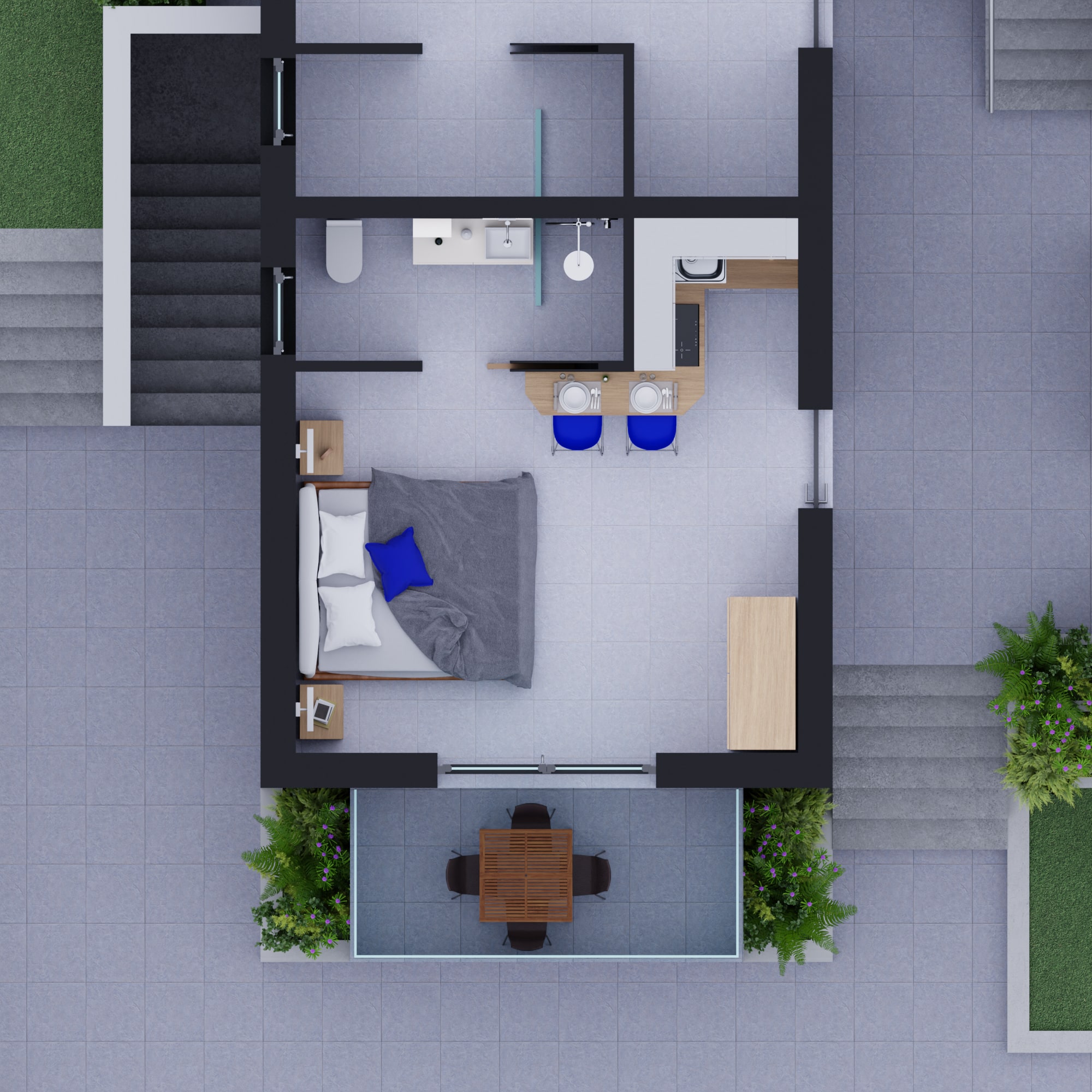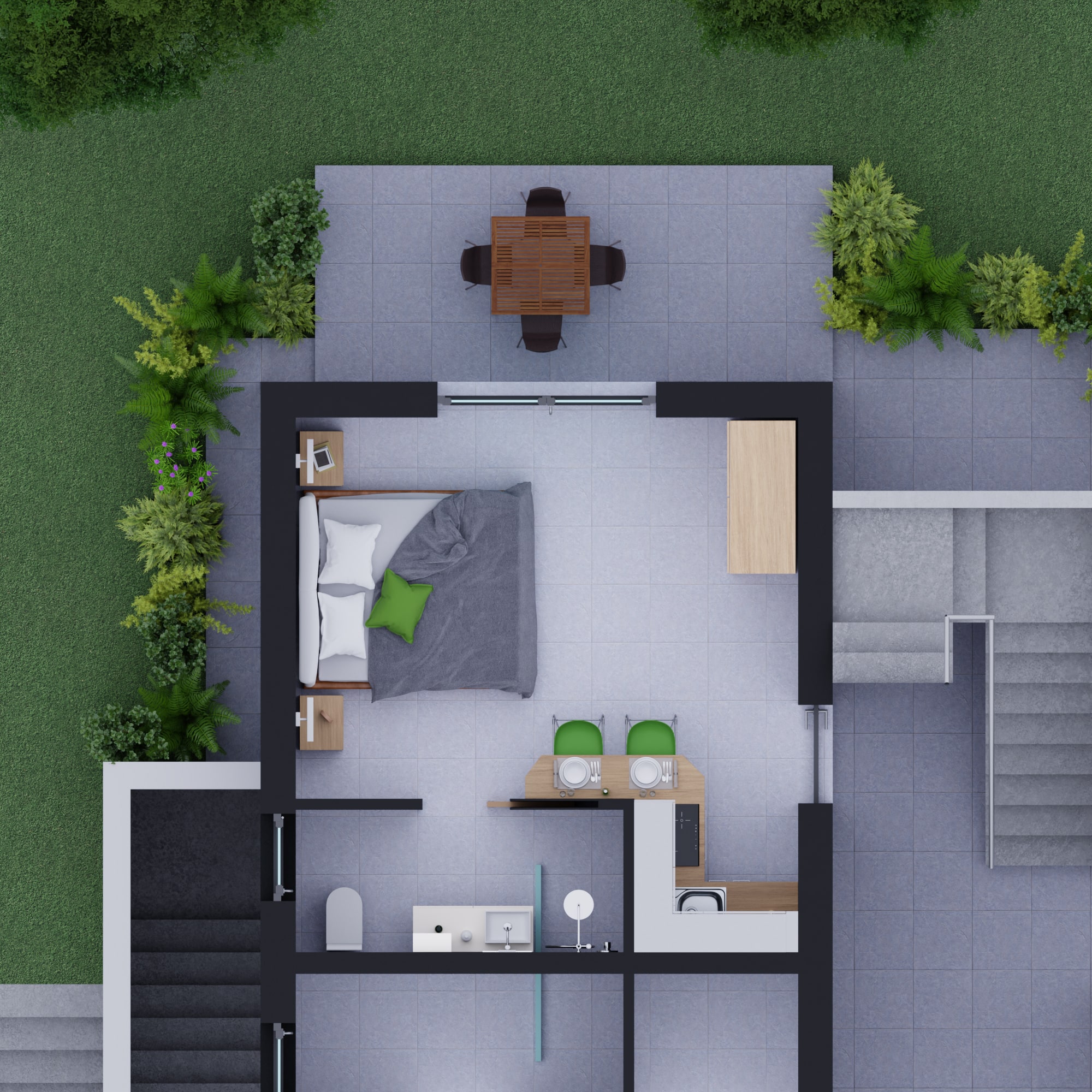 •  camera con letto matrimoniale e angolo cottura