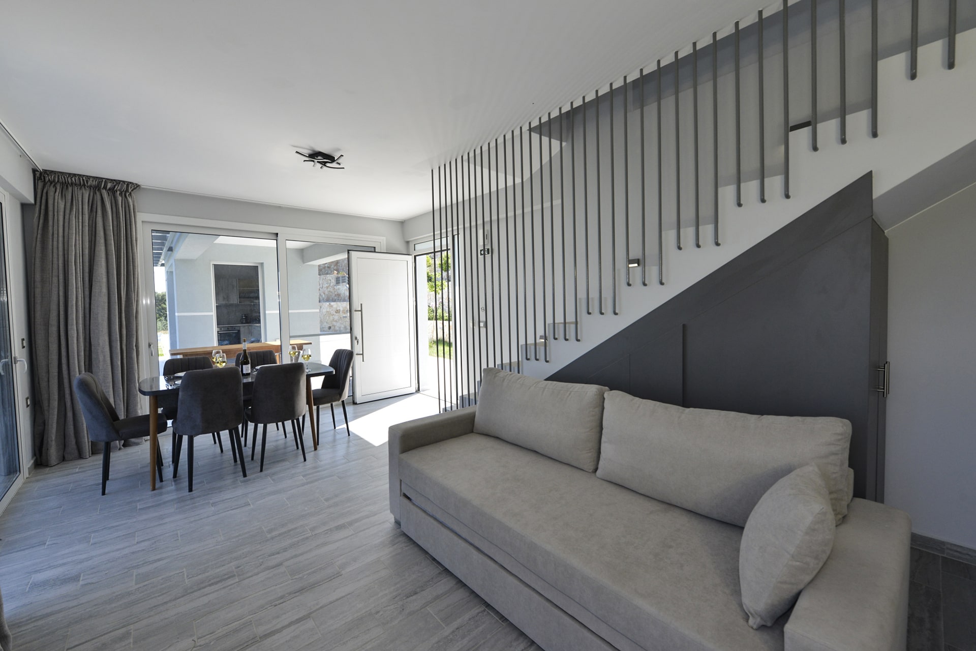 Gli interni della villa sono stati progettati con grande cura per offrire comfort, funzionalità ed eleganza. Lo stile contemporaneo si integra perfettamente con l’ambiente naturale circostante, grazie a tonalità neutre, materiali di qualità e grandi vetrate che lasciano entrare la luce del sole e aprono lo sguardo sul mare.