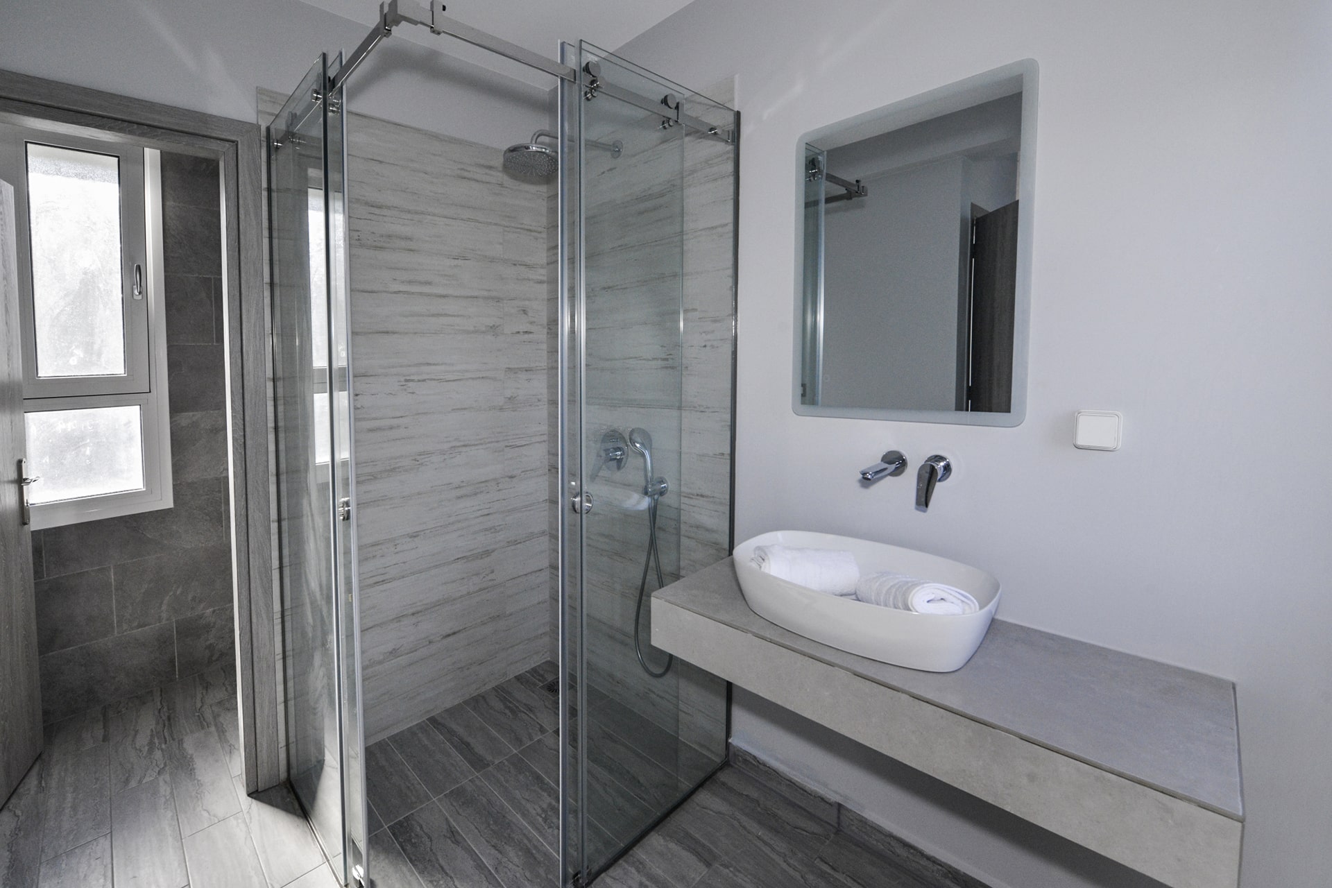 Due bagni moderni, entrambi con doccia spaziosa, lavabo e sanitari sospesi, rivestiti in materiali effetto pietra per un tocco elegante e naturale.